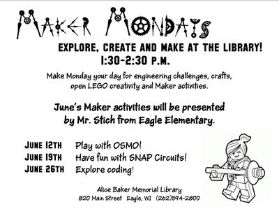 Hands-on science for kids. There will be open building with Legos, building materials available for young kids, crafts and an engineering challenge. June's Maker activities will be presented by Mr. Stich from Eagle Elementary.