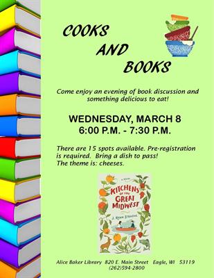 Do you love to read? Have a passion for cooking? The book for March will be Kitchens of the Great Midwest by J. Ryan Stradal. The food theme will be cheeses. Please register in advance for this program. 15 spots available!