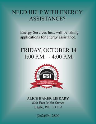 Energy Services Inc. will be taking applications for energy assistance the afternoon of Friday, October 14. Income guidelines are available at the library.