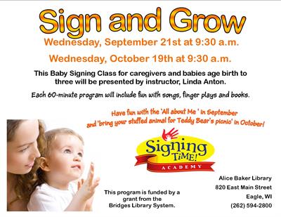 Each 60-minute program will include fun with songs, finger plays and books. The "bring your stuffed animal for Teddy Bear's picnic' will be in October. This program for caregivers and babies age birth to three is funded by a grant from the Bridges Library System.